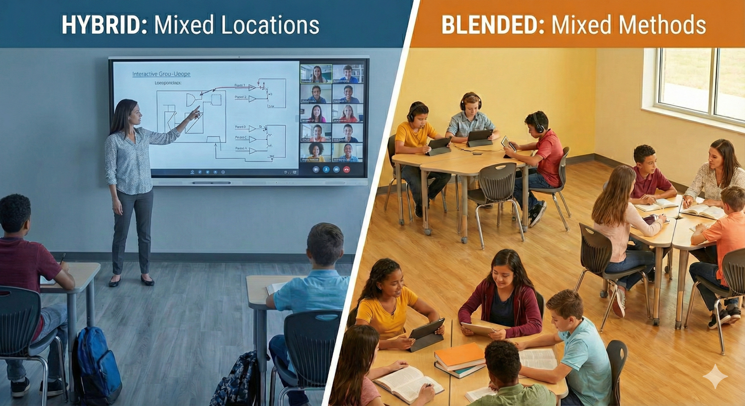 - Blended Learning: Learners are typically together. The goal is to use digital tools to enhance the physical experience.