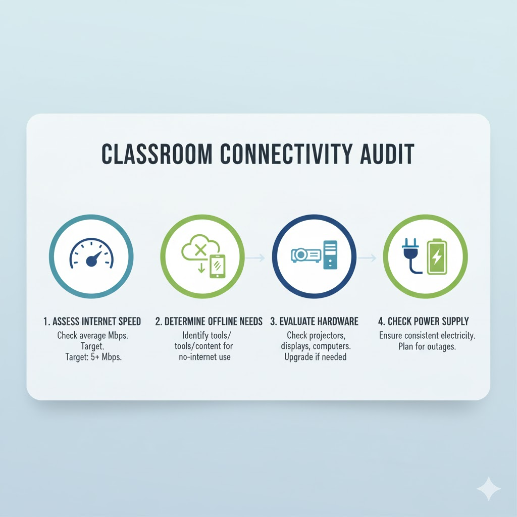 Before implementing any digital classroom equipment, it is crucial to perform a connectivity audit to assess the available internet resources. This audit will help you determine the type of equipment needed and identify areas where you might need additional resources.