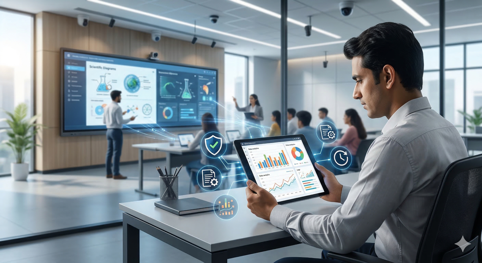 - Interactive displays or projectors replace traditional blackboards with a touch-based, multimedia-enabled screen.
